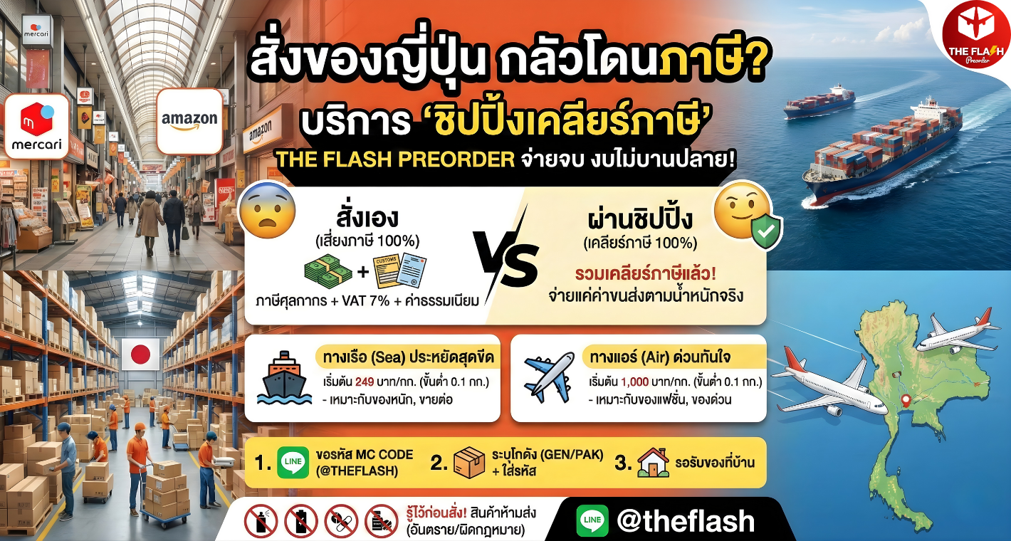 สำหรับใครที่อยากสั่งของจาก Mercari, Yahoo Auction หรือ Amazon Japan ไม่จำเป็นต้องลุ้นระทึกอีกต่อไป เพราะ THE FLASH PREORDER มีคำตอบที่จะทำให้การนำเข้าสินค้าญี่ปุ่นเป็นเรื่อง "ง่าย" และ "สบายกระเป๋า" ด้วยระบบ เคลียร์ภาษีให้เสร็จสรรพ