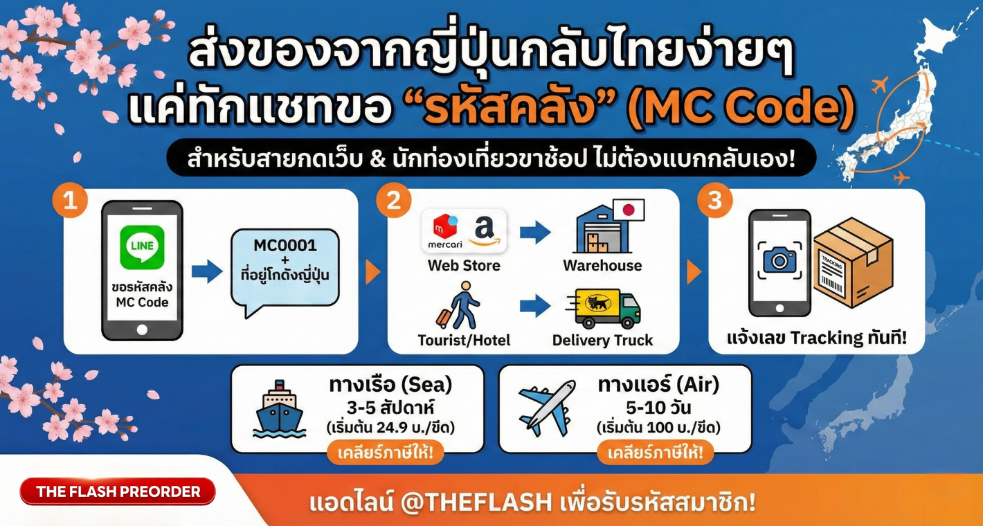 อันดับแรก ให้แอดไลน์ @THEFLASH (มี @) แล้วแจ้งแอดมินว่า "ขอที่อยู่โกดังญี่ปุ่น" หรือ "สมัครสมาชิก" ทีมงานจะออก รหัสสมาชิก (เช่น MC0001) พร้อมส่งแพทเทิร์นที่อยู่โกดังที่ถูกต้อง ทั้งภาษาญี่ปุ่นและอังกฤษให้คุณนำไป Copy & Paste ได้เลย