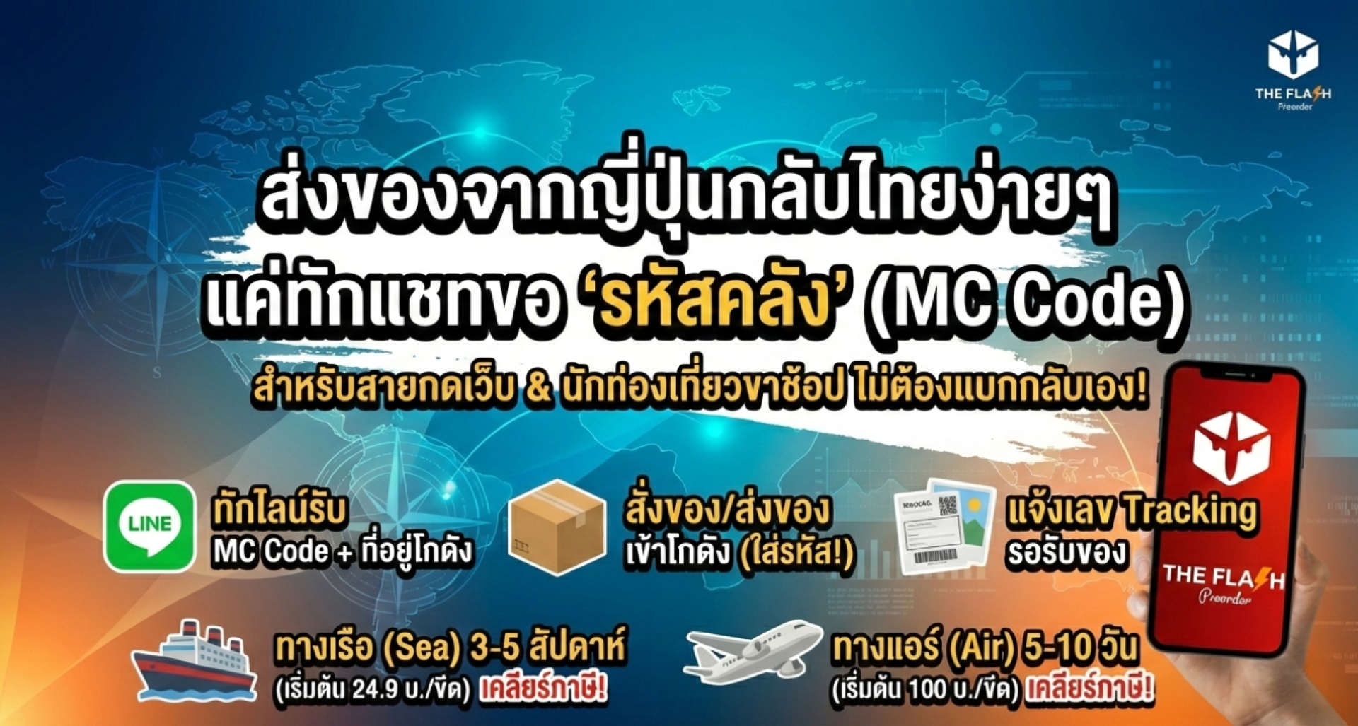 อันดับแรก ให้แอดไลน์ @THEFLASH (มี @) แล้วแจ้งแอดมินว่า "ขอที่อยู่โกดังญี่ปุ่น" หรือ "สมัครสมาชิก" ทีมงานจะออก รหัสสมาชิก (เช่น MC0001) พร้อมส่งแพทเทิร์นที่อยู่โกดังที่ถูกต้อง ทั้งภาษาญี่ปุ่นและอังกฤษให้คุณนำไป Copy & Paste ได้เลย - ขั้นตอนที่ 2: สั่งของ/ส่งของ เข้าโกดัง