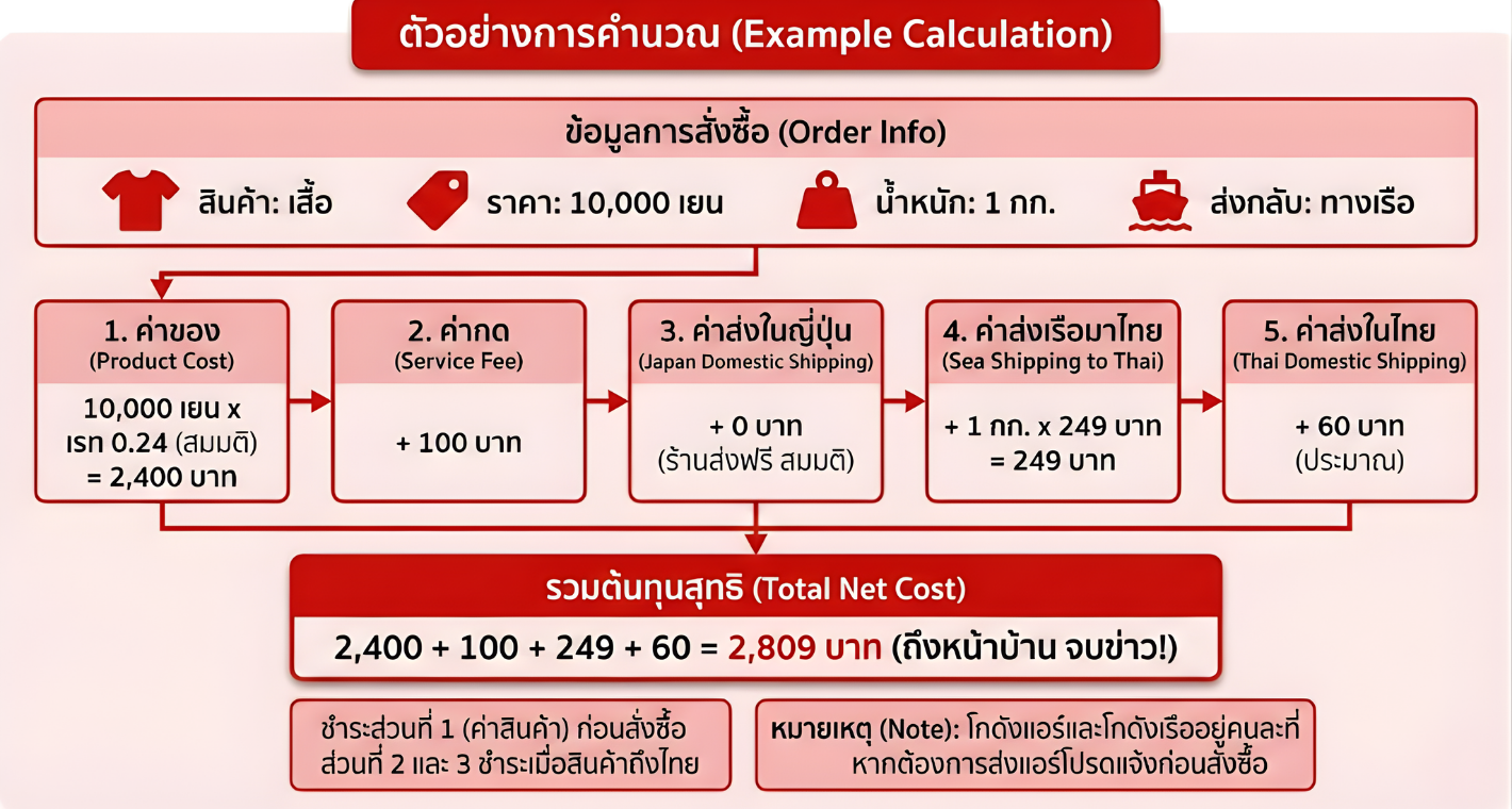 สมมติสั่ง "เสื้อ" ราคา 10,000 เยน (น้ำหนัก 1 กก.) ส่งกลับ ทางเรือ: